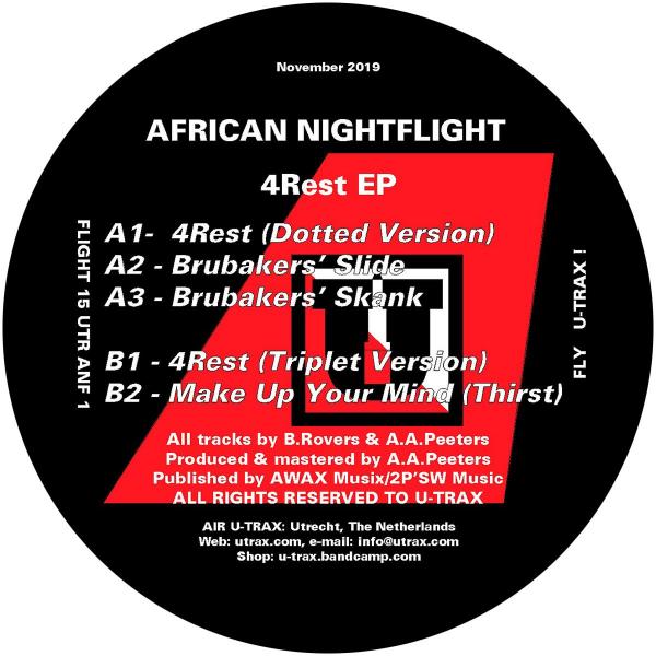 African Nightflight sees Dutch techno pioneer Arno Peeters from Utrecht team up with Nijmegen-based fellow sound scientist Bart Rovers. Back in 1996 they made five stunning tracks that are hard to define, let alone to categorize. "Otherworldly" perhaps is a fair attempt. The title track "4Rest" for example, comes in two mixes (Dotted Version and Triplet Version), both uptempo and with a distinct Arabic sound and feel. They still work perfectly in any high-energy DJ set today. "Brubaker" goes in the opposite direction in terms of BPM: both "Brubakers' Slide" and "Brubakers' Skank" are heavy sci-fi dub tracks that evoke memories of the best On U-Sound dubworks. The EP is topped off with the wonderful and spacey sound adventure "Make Up Your Mind (Thirst)." This was the first of the final three releases of U-TRAX in the 90s, together with EPs by Maarten & Tjeerd and Sonar Base, that heralded a new and quite deep form electronic (dance) music. All three were released after the infamous collapse of the industry of Summer 1996, so none of them were sold out at the time, but they are all very dear to us. When this EP was originally released, it came with one of the patented corny U-TRAX press releases, in which a new airline service to the African continent was announced (Air U-TRAX), offering "travelers" a one-way ticket to any place on the continent for just under 200 Dutch guilders (cheap in those pre-budget-airlines-days!). The only catch was that passengers were dropped off from the planes on a parachute, because "landing was too risky". Also, the airline only flew by night, to "...reduce [the] risk of gunfire or rockets being aimed at the planes." The first 15.000 travelers received a free copy of this African Nightflight EP. Not surprisingly these all got lost or broken during the parachute jumps, making mint copies of the record a rather rare commodity. The good news is that some original vinyl copies are now available again through Triple Vision Distribution as of November 22, 2019. Re-mastered digital versions of the tracks are available for downloading and streaming on the same day. Original release date: September 1996.
