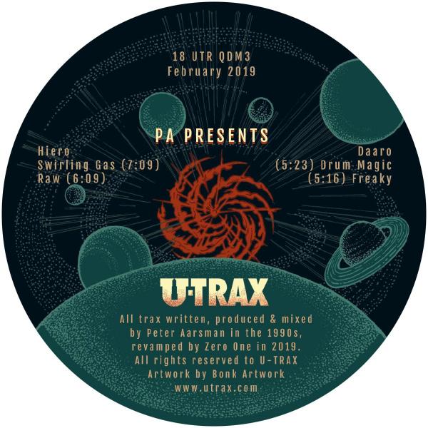 Legendary Utrecht DJ and producer P.A. Presents (Peter Aarsman) returns with his first new release since 2000 with this vintage techno stunner, Swirling Gas. This EP also marks the first new music on U-TRAX in more than 21 years, kicking the label s comeback into a higher gear. Peter ironically is the only artist on U-TRAX that actually is born and bred in the city of Utrecht. Even more irony lies in the fact that he hasn t lived in the city (or stadsie in Utregs, the local dialect) for the past 25 years. Peter knew he wanted to be a DJ since he was ten years old, in a time when this was still a very unusual career to dream about. Long before house music had landed in Europe, Peter was fiddling around with disco and italo 12 -es and all those years of training is what made him the superior DJ that he still is today. In terms of skills, flair, energy and feel for the dance floor, there are probably not a lot of DJs that can rival with Peter. While the era of house of techno of the late 80s and the 90s brought him countless DJ gigs, his reputation didn t cross the city borders much, until he bought his first gear and started producing techno music himself. Again, his DJ background proved helpful with producing his tracks, as most of his tracks are dancefloor orientated and usually have an impeccable timing. Peter debuted with the mini-album Salicylic Acid on U-TRAX in 1993, followed by the Flight Stimulator EP a year later. Both are classics today, but neither brought him as much fame as his 12 Entangled did on Deviate, a record label that was started by a couple of our friends from Utrecht a year prior to U-TRAX. Entangled made it to many charts and compilation albums, including Carl Craig s mix CD as part of !K7 s DJ-Kicks series. Besides two releases on U-TRAX and three 12 -es on Deviate, Peter recorded a full length album for the latter label. Unfortunately, before the album ever saw the light of day, Deviate closed their doors and the tracks remained on the shelves for the next 17 or so years. These tracks still sound surprisingly fresh and original today and we are super excited to be able to release some of them on this Swirling Gas EP! The title track Swirling Gas obviously gets its name from the documentary sample that the track kicks off with. The almost heartbeat-like electro rhythms, layered choruses and dreamy synths will give you goose bumps all the way to the soles of your feet. Raw is quite another thing, but way more complicated and sophisticated than the title suggests. An in-your-face electro bass drum pattern supports layer after layer of additional rhythms, some even touching on salsa, and then big fat layers of pulsating synths take you away into deep space. A unique track that will instantly reward the DJ that has the guts to play it for her/his audience. Drum Magic on the flipside is exactly that: a magic techno trip built around complicated syncopated drum rhythms, which should serve the adventurous DJ well as a foundation for mixing all sorts of weird stuff on top of. We can t wait to see videos appear with creative mixing ideas. Final track Freaky is opening with some heavy pounding, yet jumpy beats before it opens up into a bit of a space trip around the 3 minute mark. Though the track has a touch of the Basic Channel sound, its echoing synth tones are very distinct and will light up any venue, no matter how big. All tracks have been revamped and edited into more current lengths by DJ Zero One, blessed by DJ White Delight and mastered by Thee J Johanz. Label art by Bonk Artwork. The EP is available for download and streaming and in black and limited edition moss green vinyl from February 22, 2019.