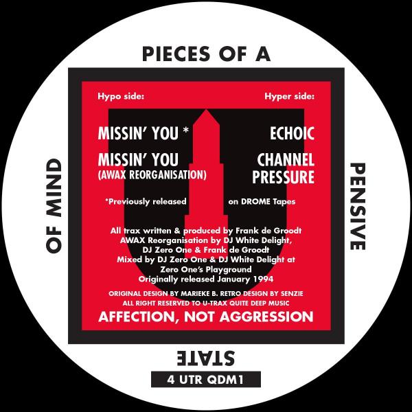 Exactly 25 years ago, in January 1994, U-TRAX released an EP from a new young talent from the Utrecht area. His name: Frank de Groodt, who's debut Missin' You EP immediately established his name as a techno and electro phenomenon. This re-release of the original techno beauty is the first of two releases that U-TRAX will put out in January 2019 to celebrate Frank's 25th anniversary as a recording artist. Frank at the time lived in Hoevelaken, a small town outside the city of Amersfoort, which is where he was born and lives again these days, some 30 minutes northwest of Utrecht. For his first release he picked the rather unusual moniker Pieces of a Pensive State of Mind as his artist name. Later in 1994, he released his first 12"-es on Djax records as The Optic Crux, and he continued to keep making up artists names in the following 25 years: Sonar Bass, Fastgraph and The Operator. He is also one half of the live outfit Random XS (together with U-TRAX veteran DJ Zero One), collaborated with Arno Peeters (a.k.a. Spasms) as Urban Electro and with Detroit's Dennis Richardson as Ultradyne. And that's not even all of his alter egos. All four tracks on this re-press have been remastered for maximum impact, including two versions of the title track. Like all beautiful art, Missin' You is inspired by heartache, referring to a lost love. This track appeared a year prior on the notorious Drome Tapes cassette label, the predecessor of U-TRAX. The Awax Reorganisation is a remix by U-TRAX label boss DJ White Delight, with the help of DJ Zero One and Frank himself, transforming it into a long ambient-ish technotrip. The flipside is where things get even more exciting, with the funky Detroit-techno style Echoic, still a favorite of popular modern-day DJs like Hunee. We have to issue a small warning regarding the closing track: the bassdrums are deformed by a flanger and reverb and the combination with the latest record cutting technology makes Channel Pressure not only a freaky and pumping track, the disorienting sound can also make the audience on the dancefloor a little nauseous! Original release date: January 1994. Re-release scheduled for January 11, 2019. This special 25th Anniversary Release will be available in digital form for purchase and streaming, on black vinyl and limited edition silver vinyl.