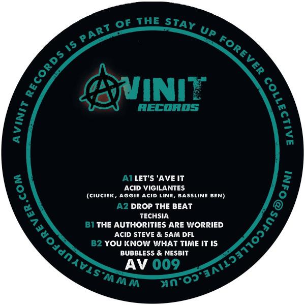 Acid Steve's Avinit Records returns with 4 warehouse thumpers direct from the squat party underbelly of London's Acid Techno scene. Acid Vigilantes ramp up the 303's and add some neat vocals, whilst Techsia slams it out nu-style with hard kicks and plenty of venom. On the flip side Acid Steve and Sam DFL go gnarly with some proper Acid Techno, whilst Bubbless and Nesbit go old-school with firing 909 and 303 analogue mayhem.
