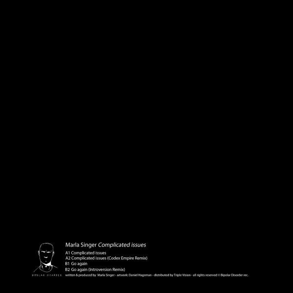 French producer Marla Singer returns to Bipolar Disorder to release an emphatic techno EP titled "Complicated Issues" with remixes from Vienna's Codex Empire and Arts Collective's Introversion. Murky oscillations, thumping kicks and growling resonance take the focus in "Complicated Issues" before Codex Empire's remix delivers machine-like atmospherics with rumbling low-end and screechy melodies. On the flip, "Go Again" offers winding synth flutters balanced with obscure oscillations and rattling percussion until Introversion's remix throws down breaks tinged percussion, angelic pads and emotive break downs which harmonise creating a euphoric ambience.