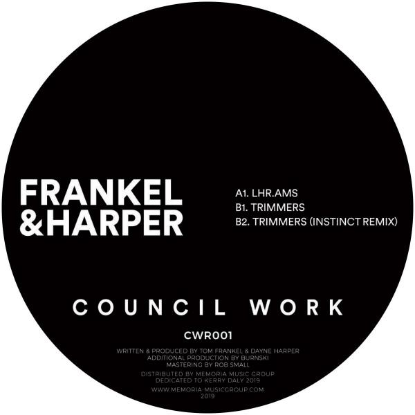 The debut EP on Council Work from label owners Frankel & Harper. The Trimmers EP contains 2 originals, the first in the form of "LHR.AMS", a heavyweight slice of UKG with strong influences taken from the European house scene and also their drum n bass background. "Trimmers" is a raw dub and jungle infused cut with a sub layer guaranteed to shake speakers stacks. INSTINCT joins for a remix and switches things up by adding a catchy vocal which definitely passes the old grey whistle test.