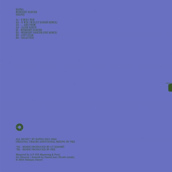 Dalmata Daniels third LP comes from Rapha, marking his return to the label after contributing to its split and compilation series. Known for bold acid treatments and dark, futuristic tones, Rapha takes his craft to new heights on Midnight Dancer, which also features remixes by CT Kidobo and PRZ. The album opens with I Win U Win, pulling listeners into an adventure of pulsing basslines and cosmic, minimal electro. CT Kidobos remix then twists it into a darker, seductive French-inspired club sound. The third track, ...And Them, continues the journey of the opener with mechanical beats and textured soundscapes, while Alien Dance highlights Raphas signature sharp, distinct style leaving a strong mark on the deep electro club scene. On the flip side, Midnight Dancer plunges into a hypnotic realm of haunting echoes and distorted rhythms, with heavy basslines reverberating through the darkest corners of the mind. PRZs remix of the title track retains the original groove but adds a cleaner, equally impulsive electro edge perfect for the club. The albums final tracks, Lost Start and Galactico, round off the journey with shimmering electro patterns and eerie, alien soundscapes, leaving an unforgettable impression. In Midnight Dancer, Rapha showcases his ability to blend industrial grit with cosmic melodies, delivering hard-hitting electro suited for both club play and immersive listening at home or on a night ride. Be warned DDLP03 is limited to 150 copies, housed in a Studio Jetski designed jacket with a digital download card and shrink wrap.