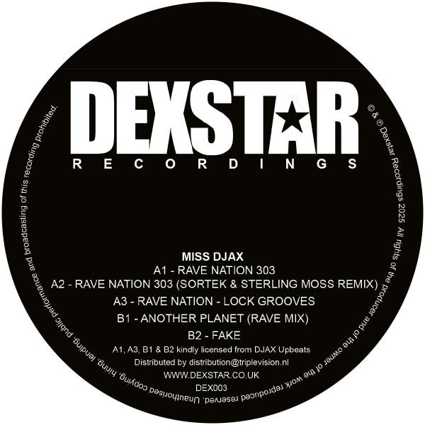 Dexstar Recordings returns with its third release - a solid white vinyl featuring three tracks from the Acid Queen, Miss Djax. These tracks, licensed from the seminal label DJAX Upbeats, were previously only available in digital format. The record also includes a brand-new Acid techno remix of "Rave Nation 303" from label boss Sortek and legend Sterling Moss.