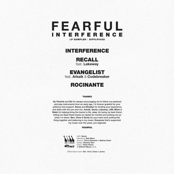 As so many great schemes do, it started with a conversation in a pub. After several sporadic releases on Diffrent Music, including his renowned 2013 debut "Tongues", label boss Dexta wanted more music from Fearful. One thing led to another, and suddenly an album was in the works. The result is "Interference"; a body of work that is reflective not only of the personal idiosyncrasies and aspirations of its London-based producer, but of an artist who has truly been set free of expectations. Harnessing his own inbuilt need to defy convention, and looking to influences such as classical game soundtracks, experimental mastermind Amon Tobin, and the brooding tones of Akkord and Lorn, Fearful has crafted an album that's unpredictable yet cohesive, and definitive of his aim as an artist. From the menacing ambient opener "Rocinante", through the glitchy techno of "The Traveler", skewed drum & bass of "Pulse 0" and "Through The Mist", to the roaring drone and pounding metal-inspired drumwork of closer "Gold To Dust", it's an album that demands full attention and repeat listening. Nowhere is this free-roaming but pull-no-punches attitude summed up better than the title track. Building through eerie, twisted atmospherics - samples of electromagnetic interference, which can be found throughout the album - it clatters into a domineering breakbeat, before collapsing into a guttural, tribalist techno roller. Where much of dance music draws on repetition, the concept of "Interference" is simple: progression. Whether that be changing motifs within tracks, switching genres within the album, or developing upon Fearful's own artistic strengths, it's an idea never more at home than on Diffrent Music, and we are very proud to present it.