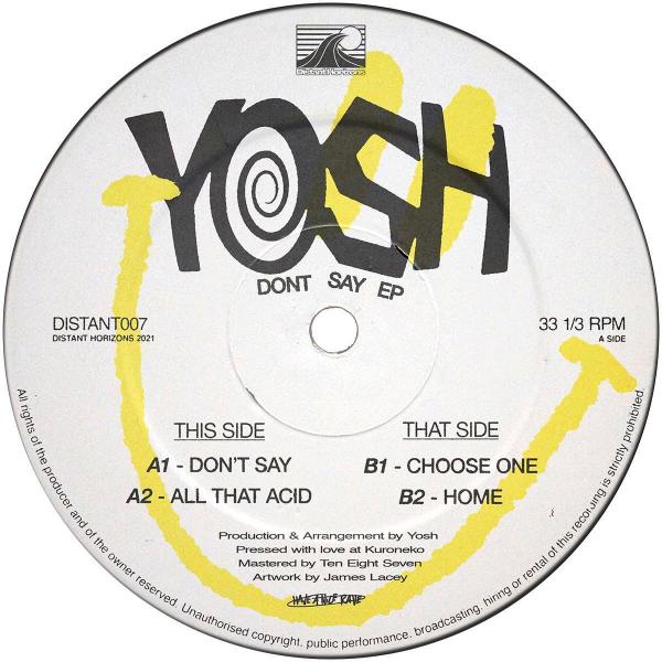 DISCOUNT - London producer Yosh continues his hot streak of putting out a twelve inch a month with typically breaksy, UK focused EP on Distant Horizons that further earmarks the emerging artist as one of the producers to watch in 2021. Following releases on Time Is Now and an announcement on Desert Sound Colony's Holding Hands sub-label, Yosh serves up four steppers that navigate us from the doors of the club to front left of the speaker. 'Don't Say' is a fast cut of subby breakbeat-garage; the producer's knack for emotionally stimulating vocal samples and peak-time basslines moving into the frame. 'All That Acid' gives squirming acid lines and stripped-back percussion, mutating the breaksy, UK energy into something more electro focused, and in doing so provides what could be the score for an old racing video game, before 'Choose One' takes us back into familiar Yosh territory with a cut of dreamy garage, with the odd dubby wobble for good measure. We finish on a personal note with 'Home', a cut that epitomises that good feeling that can only come with returning to a place of comfort; relaxed atmospherics and 2-step rhythms providing the perfect warm up number.