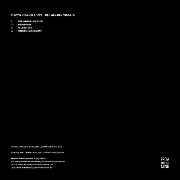 From Another Mind continues to establish itself as a vital contemporary techno outlet with a fresh release entitled "Der Weg Des Kriegers EP" from label founders SHDW & Obscure Shape. This German pair hails from Stuttgart and share a unique vision in the studio. They have a no frills, straight up vibe that results in tracks designed for darkened spaces and serious crowds. As DJs they draw on the old and the new from acid, EBM and rave, and match the energy of their productions in their sets. After a big 2019 they keep up the pressure here and head into the new year in fine fashion. First out of the blocks is the brilliant "Der Weg Des Kriegers" with its hammering, high speed kicks and choppy percussive patterns. A distant, sombre siren draws you ever further in as the track rolls on relentlessly and grows ever more wild. "Endgegner" is an all-out frazzled techno rave with scraping hits and distorted kicks driving along and whipping crowds into a frenzy. Picking up the pace is "Feuersturm", five minutes of banging techno with arresting synths shooting out of the mix like lasers and sure to get hands in the air. Closing out this high impact trip is "Hinter Dem Horizont" which bounces along on tightly programming and slamming drums, with a dancing synth sequence that adds just a little light to the darkness all around. SHDW & Obscure Shape "Der Weg Des Kriegers" drops on From Another Mind on 6th March 2020.