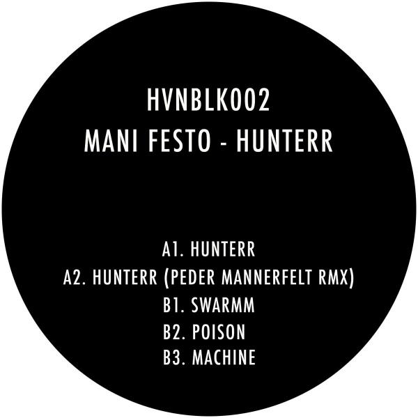 HAVEN are proud to present the second record in their black label series focused on the crossover between sounds on the UK bass music spectrum and hard techno dynamics. This time UK break-beat maestro Mani Festo joins the label for the first time with an EP of hardcore- inspired dance-floor weaponry alongside a remix from Swedish experimentalist PederMannerfelt. The A side kicks off with 'Hunterr' with booming vocal cuts, pounding 4-4 kicks and break-beat rhythms sprinkled throughout for a prime UK hardcore and techno genre crossover slab of club material. This is followed by the Peder Mannerfelt remix where the Swedish legend brings his left-of-field sensibilities to the fore, submerging the vocals in to a ghostly high-frequency spectrum whisper alongside a looping bass-line and sludgy drum rhythms to close out the first side. The B side starts with 'Swarmm' - a broken beat roller filled with screeching synth zaps and a mammoth break-beat in the second half. Up next comes 'Poison' with its eerie atmospheres and drones sat behind a 4-4 rhythm and charging break-beats in another dance-floor killer. Finally 'Machine' closes the EP with its syncopated electro rhythms and funky UK swing alongside chugging bass plucks and arpeggiated melodies in one more crossover hammer.