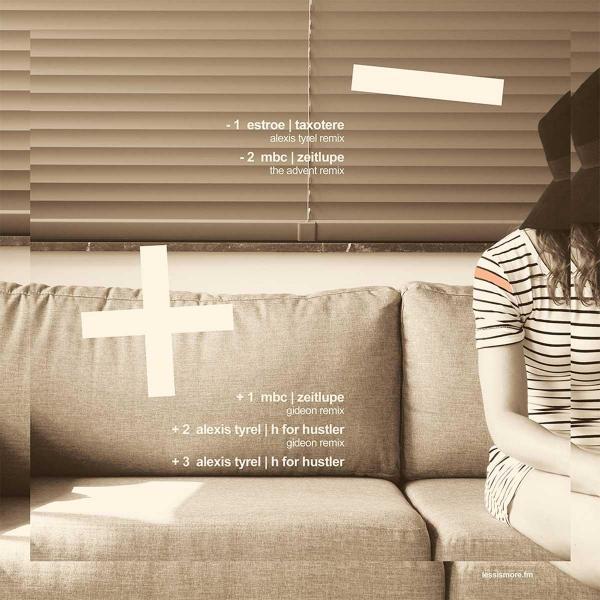 Lessismore (formerly Lessismorecordings) was launched 10 years ago, and has been on hold for a few years. At the time the transition from vinyl to digital didn't feel right and now that the vinyl market is coming up again the love and faith to release a beautiful product (vinyl with cool artwork) is back.This 10 year anniversary is a good reason to revive from hibernation state and to start sharing great music again. The first few releases from the relaunch will represent re-releases of the strongest EP's from the back catalogue with remixes by respected artists. The Alexis Tyrel remix of Estroe's Taxotere has a palpable energy which comes from the masterful fusion of pounding kicks and luminous synth stabs that swell and bulge out through the mix like bright flashes of summer lightning. The Advent remix of MBC's Zeitlupe starts with a galloping synth that builds in intensity. Just as one is lulled into a "false feel" of the track, the synth part transforms into the syncopated groove of the original version. The track fluctuates between both patterns periodically. With several intriguing modifications of the main sound throughout, and with a pacey aggression, this track is both fierce and deep. Gideon also remixes Zeitlupe and in his version the intensity is increased a little more. The main groove is prevalent again which drives this remix. However, the real profound sections are where the beat breaks down and yields to the resonantly electrifying lead synth which consumes all in its path. Conspicuously powerful and driving. Once more on remix duties, this time Gideon interprets Alexis Tyrel's H for Hustler. Rhythm and percussion based, it exemplifies Lessismore's ethic - it is both fundamental and bold. Strong and steady machine like beats push the track along relentlessly while industrial scrapes grind away on top. The "Hustler" sample is sporadically placed but is still used enough to give a hypnotic feel to its use. The original version of H for Hustler by Alexis Tyrel focuses on the basic elements that are at the core of timeless dance classics. The captivating and hypnotizing beat powers its way throughout. The "Hustler" sample is used rhythmically to great effect while the perfectly aimed machine-gun snares find their mark and are perfectly positioned to hold attention and build atmosphere where needed. Estroe's original mix of Taxotere has a fast paced and tropical feel to it. The intoxicating samba rhythm is sublimely mesmerising with its subtle variations while the track races along. Vast, reverb - soaked, resonant stabs flash high above the main mix while warmer and closer chord stabs pulse, expand and contract (Digital only).