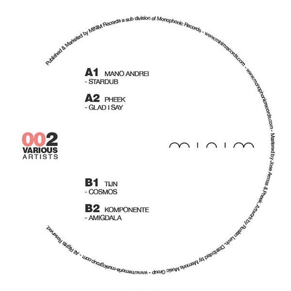 MINIM Records gathers a quartet of bumpin' sleek sounds from around the globe for the anticipated 002 VA. 'Stardub' finds Romanian producer Mano Andrei layering ethereal, muted pads over some raw percussives, tight driving kick and body moving bassline, while Montreal gearhead Pheek's 'Glad I Say' mates tech house bounce and sine-wave wubs to a creaky, industrial sonic palette. UK trackslinger TIJN pictures the 'Cosmos' bursting with angular breakbeats and 4/4 subs, as the talented Ukranian producer/dj and Tvir label boss Komponente tweaks percussive tones, punches the kick, and adds a coating of sonic grit on the brain-bending 'Amigdala.'