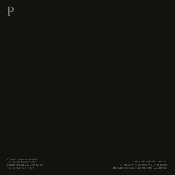 EMX SERIES PT. III [printed sleeve] Phara Record label Phaaar Catalog Number PH007 Release Date April 24th 2026 Genres Techno Tracks playpostitleartistsdurationplay_circle_outlineA1Strike3play_circle_outlineA2Sequencedplay_circle_outlineB1Pine Barrensplay_circle_outlineB2Static Field (Studio Edit)play_circle_outlineB3Intro (Vocoder Edit) .