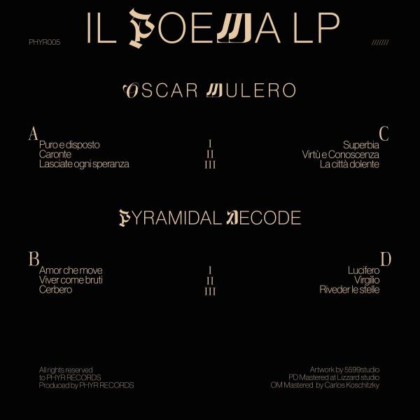 PHYR0005: A landmark double split black vinyl from PHYR Records. Label founder Pyramidal Decode joins forces with techno luminary Oscar Mulero for "Il Poema," a 12-track odyssey inspired by Dante's La Divina Commedia. Artwork features Bosch's El Jardin de las Delicias, design by 5599studio.
