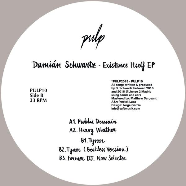 Damian Schwartz' "Existence Itself" is a compilation of well composed melodies that evolve, while gliding over the backbone of dance floor rhythms. Whilst containing five tracks, this record feels and breathes like a full length. "Public Domain" shows Schwarz' knowledge of jazz composition. The opening track contains chord progressions that are unusual in popular music, but should soothe a more trained audience. Nevertheless, "Public Domain" is a positive composition that should appeal to selectors worldwide. "Heavy Weather" is dripping with modulated chords, thoroughly selected bits of FX, and otherworldly arps. Deep rhythmic drum patterns guide the track into alterations of mood and a warm bath of intelligent melodies. "Tyner" is a funked-out piece of work that sounds like a perfect PULP records. It's this track where Schwarz shows that he is up there with the giants of modern day funk sounds. Large synth basses growl through the palette, and an oozing lead synth serves as the recognizable element. For the B2, a beatless version of Tyner is added to this package. This should be a welcome and fun element for selectors to play around with. "Former DJ, Now Selector" is a breathing, positive track that's the perfect ending to a versatile work like "Existence Itself".