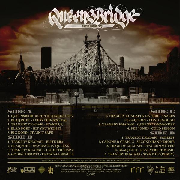 Mista Sweet presents: Queensbridge To The Hague City New York City's Queensbridge aka "The Bridge" is one of the most famous and fruitful areas in HipHop. A raw, gritty street sound with excellent lyricism is the trademark. Where many new Rap releases seem to have lost their rawness, the double album "Queensbridge To The Hague City" brings back that original hardcore Rap. The album is entirely produced by The Hague City's Mista Sweet, a HipHop veteran known for his production quality and superb DJ-ing. For this release he teamed up with some of the most legendary MC's to ever do it, creating one of the rawest albums in years. "Queensbridge To The Hague City" features: Blaq Poet (of Screwball), Tragedy Khadafdi (aka Intelligent Hoodlum), Big Noyd (rapper Noyd), Capone (of C-N-N / Capone-N-Noreaga), Nature (The Firm/Dr.Dre), Craig G (original Juice Crew), Godfather Pt3 (Infamous Mobb) and Piif Jones (Dave East affiliated). Not to exaggerate, but "Queensbridge To The Hague City" is definitely what the worldwide hardcore heads have been longing for. Brought to you by Redrum Recordz and Next Gems.