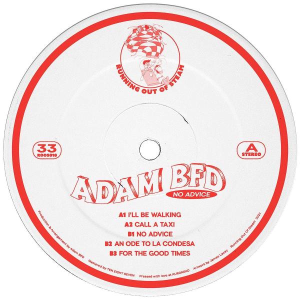 Originally from Normandy now residing in the country's capital, French DJ and producer Adam Boufeldja (aka Adam BFD) has been making a serious name for himself, having put out a string of self-released singles and curating his own self-titled Youtube channel. Adam's tracks have always been vivid, detailed portraits; drawing from memories and influences from around the world, and his latest EP on Running Out Of Steam is no exception; using his eclectic tastes to produce a record truly unique, and brimming with personality. 'I'll be walking' meanders through an always evolving city, creating space and sense of an otherwise chaotic and fleeting world. The track's softly spoken synths hold the torch, while the effortless drums walk us home. 'Call A Taxi' follows suit, a fruitful marriage between shuffling drum patterns and hypnotic tones, while the track's subtle low-end provides the glue; closing off an A side that feels more like a story being told than another dance-floor memento. Title track 'No Advice' launches the B side on a slightly more ominous tone, in a microcosmic portrait of opposing forces; before 'An Ode To La Condesa' glides through like a letter from an old friend, the smell of fresh ink still prevalent on the page as we're whisked away through the wide-tree lined avenues of La Condesa. The EP comes to a close with 'For The Good Times' combining nostalgic tinged leads, forward-marching drums and sprawling pads that act as a backdrop to another highly impressive EP from one of France's best emerging artists.