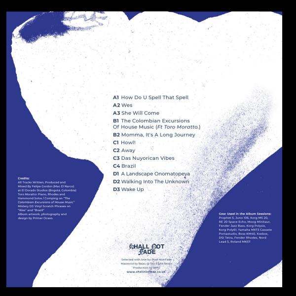 - 2024 repress - Hot on the heels of two EP releases on Bristol label Shall Not Fade, Felipe Gordon is preparing for the release of his debut album on the important UK imprint. With human contact at an absolute minimum, it's refreshing to hear an electronic music record that ventures away from the machine in favour of the organic. Gordon's ability to blend complex jazz instrumentation with acid-licked basslines, golden-age house aesthetics and the cultural sounds of South America is unrivalled; creating distinctive, beautiful and exciting house records from his home in the Colombian capital of Bogota. "A Landscape Onomatopeya" was crafted through the concept of a painting; exploring shades, changes of tone, use of light. "I found myself making tons of music and wondering how to start an album process", he says, "something with more concept; a long journey between all the different musical influences in my head. I wanted to try to accomplish something with soul, deepness and an inherent melancholia to it. More organic, more human." The record - which includes the Spanish word Onomatopeya as a Colombian statement and ode to the Latin American house scene - kicks off with the early evening funk of "How Do You Spell That", the distinct sugar cane sweetness of Guaro hanging in the late sunlight. "Wes" ventures into hip hop territory; dusty boom baps, 90's scratching and live guitar provoking a vibe that lies somewhere between Dilla and fellow Colombian AvenRec before the A-side reaches its climax with a cut of Gil Scott-Heron-esque funk on "She Will Come". The B-side raises its curtain and with it comes two cuts of sublime house, each more colourful than the last. "The Colombian Excursions of House Music" does exactly what is says on the tin; fusing South American drum patterns with the creative innovation of live jazz to create a dimly lit, Latin American energy. "Momma, It's A Long Journey" maintains a more progressive vibe as it meanders through subtle acid stabs, radiant atmospherics and an oxymoronic blend of mournful, hopeful vocals. Tape throbs and breakbeats make up the C-side as we delve deeper into Gordon's sound palette: think The Cyclist and Kaytranada, but with an Ibero-American vibe. "Howl" meanders slowly through the smoke-filled booths of a jazz cafe whilst the sounds of Detroit and Chicago shatter and break ("Away", "Das Nuyorican Vibes") over the crowd below on, before "Brazil" invites you outside for a post-dance cigarette with itsdowntempo boom-bap and mellow energy. The record comes to its end with three D-side cuts that perfectly encapsulate its artistic vision. "Like the album itself, the artwork process was all about texture and analog treatment", he says. "We used old pentax cameras with black and white ilford rolls to achieve an intimate feeling. I found that my mind was drawn to a landscape with a house deep inside the Bogota mountains; where I hang all the time with my girlfriend and friends. It's a quiet, emotional place. Far from the city." Wiggling basslines, vibrant shimmers and bold jazz instrumentals bring a fitting end to a truly beautiful record, and further cements Shall Not Fade's reputation as a label with its finger on the pulse of exciting dance music.