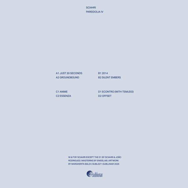 Sublunar is proud to present Pareidolia IV, the fourth chapter of the saga written by its founder Sciahri. With this new LP, the journey continues and reaches its most complete sonic expression to date a statement of evolution, depth and identity, featuring a special collaboration with Temudo. The record opens with "Just 30 Seconds", driven by powerful low-end foundations balanced by warm, enveloping textures that immediately pull the listener in. "Groundbound" follows, deep and immersive, built around a memorable synth and arrangement designed to linger in the mind. The voyage continues with "2014", a melodic and transportive track that drifts effortlessly into "Silent Embers", where raw power and mysticism merge into a uniquely intense atmosphere. The second half opens with "Anime", propelled by a massive rumble beneath a delicate groove and finely crafted stabs. "Essenza" dives into darker, hypnotic territory, defining its own distinct mood and tension. The only collaboration on the LP, "Encontro", sees Sciahri and Temudo blending their respective visions into something truly memorable, where both styles converge naturally and with purpose. The journey closes with "Offset", a reflective and emotional piece that encapsulates a sense of travel and quiet melancholy a final moment designed to resonate long after the record ends.