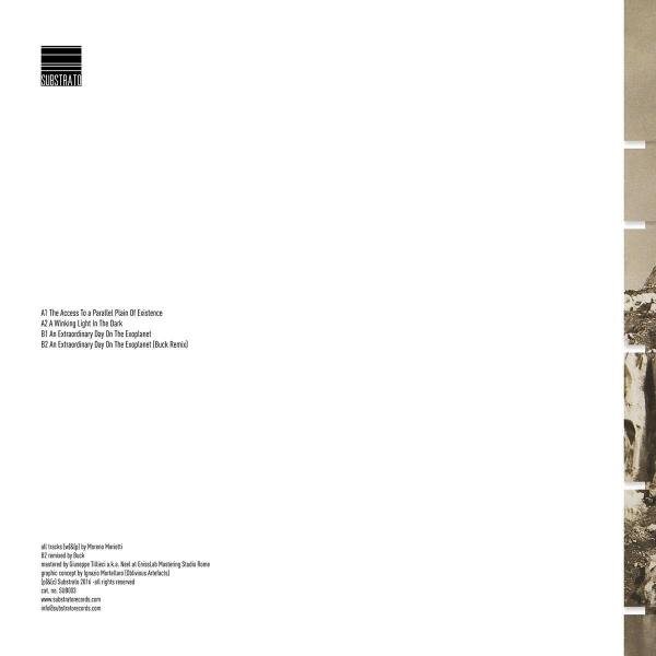 Newcomer label Substrato features Dorian Gray on its third release. Gray, AKA Moreno Mariotti, is an Italian-based artist whose music culls from a broad range of influences that rest somewhere between surrealism and sci-fi. This third installation is a canvas of obscure atmospheres and hypnagogic patterns, the textures of which play to the label's orientation towards the acoustics that embody subterranean and submerged worlds. Gray's EP creates a feeling of being within the presence of a constructive type of nature where organic and artificial sound coexist in harmony. A Winking Light In The Dark and The Access To A Parallel Plane Of Existence both make use of acquatic samples overlaid with a futurist atmosphere and straightforward beats. Extraordinary Day On The Exoplanet is perhaps the most overt iteration of the delicate balance that Gray strikes between modernist and shamanistic impulses: Gray's original version is ambient and imbued with layered samples that stretch over the length of the track, where BUCK's remix is more dance-oriented, incorporating structure, rhythm, and strokes of differently cut melodies into Gray's ethereal soundscape. The slow rhythms and repetitive atmopsheres in 003 transport the listener to a new environment. Already able to boast a discography that includes Artefakt and Edit Select, Substrato has firmly established itself as a formidable force in dark, atmospheric techno, particularly with the pertinence of this most recent release.