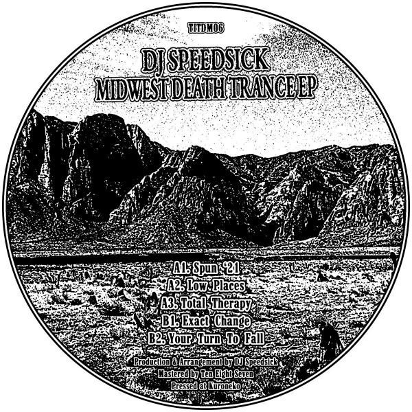 Midwest techno titan DJ Speedsick debuts on TITDM with five monstrous cuts, permeating with grunge flavored grooves and hypnotic rhythms - including a bonus digi track on 'Midwest Death Trance EP'. Opener 'Spun 21' sets the tone for the record, wasting no time in getting started. The track's rolling basslines stretch out underneath deep, weighty percussion, in a pumping club track with both warm and driving qualities. The US based artist continues his quest of making the most relentless and uncompromising techno in 'Low Places' before 'Tital Therapy' enters the frame with its louring kick drums, interwoven amongst a backdrop of industrial, dystopian unrest. B side opener 'Exact Change' is minimal in its approach, but no less effective; proving that sometimes all we need is a hammering kick drum, killer rides and understated bass notes to make people lose their minds. The record comes to a close with the heads down grooves of 'Your Turn To Fall' a seductive piece, teasing and taunting; before the digi only 'Glad To Get Away' keeps bodies moving as the club shuts and the after party begins.