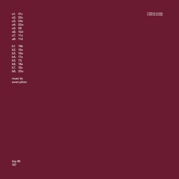 Up next on TRIP is berlin-based, but boston native, soren jahan. for his debut on the label, nina signed 16 tracks that were conceived in 2016 following a simple concept: no samples. all rhythms and sounds are synthesized and controlled with lfo modulations as well as step sequencers. the result is a minimal masterpiece straddling the line between danceable music and ambient. Soren got his start in boston in 2011 with the label supply records that he founded with john barera. since coming to berlin in 2013, he has released a string of ep's on his own labels supply, blank slate, ygrok / ssto as well as projects for the double r amongst others. these days he's also active as an analog photographer and printmaker in berlin's underground fetish scene. The 12" features special locked groove edits of all 16 tracks.