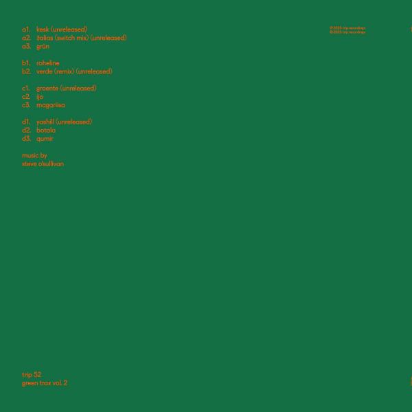 green trax vol. 2 is the second collection on trip of classic material from steve o'sullivan's green label, originally recorded between 1996 and 2005. these tracks capture steve's unique approach to minimal techno, heavily influenced by the innovative sounds of robert hood, jeff mills, and terrence dixon. recorded live in one take directly from the machines, this collection embodies raw, unpolished energy - a tribute to the spontaneity of studio experimentation. several of the tracks included were previously released on green and recontextualised for trip.