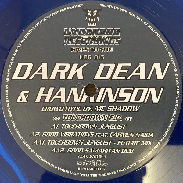Underdog Recordings is Proud to present the Touchdown Ep by Dark Dean & Hankinson with crowd Hype from MC Shadow & also featuring MC Stevie A. Originally started in 1993, one of Bournemouth's foundation Jungle Labels, Underdog Recordings taps into the wealth of Jungle talent on the south coast and the Destiny connection is strong with this release. Touchdown Junglist tracks started under lockdown by Dark Dean & Hankinson feature a sample of Fusion & Destiny's Master of Ceremonies & old friend MC Shadow. After an authentic old skool jungle mix was completed, it was decided to bring the track upto date with a 170bpm Future Mix to complement the '94 style original . Add in the much requested Dub Mix of Good Samaritan featuring another Destiny soldier, MC Stevie A that has only previously been available in the digital format and the haunting vocals of Carmen Naida on Good Vibrations and you have a fully loaded 4 track Ep on vinyl, the 16th release from Underdog On a limited Translucent Blue 12" Vinyl