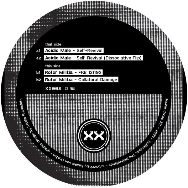 Known for their multidisciplinary parties and events that shift the technoid boundaries, Rotterdam collective Double Cross XX presents their third release: two cuts of dark hypnotic techno by rising star and one-of-a-kind producer Acidic Male, backed by driving industrial artillery from the Rotor Militia duo. Screenprint by Dineke van Oosten